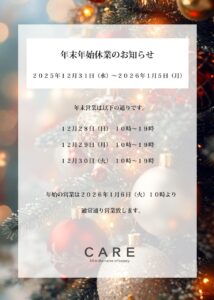 尚、年内最後の営業日12月29(月)30日(火)の営業時間は10時〜19時までとなっております。