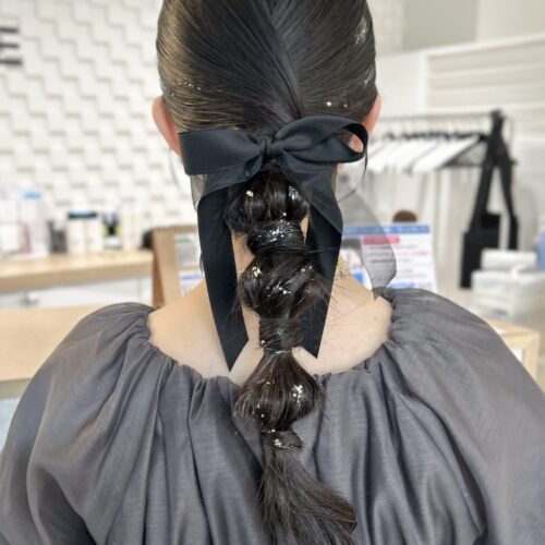 こんにちは!スタイリストの八尾です 今日はお呼ばれヘアのご紹介 リボンと金箔を使ったあみ下ろしヘア タイトと玉ねぎを組み合わせたのがかわいいです ぜひ結婚式の参列やライブ前などお任せください♪