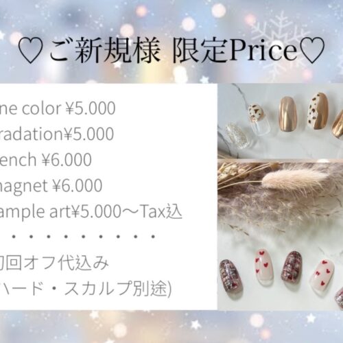 こんにちは☆ ネイリストのMARINAです♪ 12月よりネイルメニューもSTARTしております! ご新規様限定のお得なオフ込みクーポンをご用意しております♡ 追加でパラジェルベースに変更、フィルインでのオフ可能♪ サンプ […]