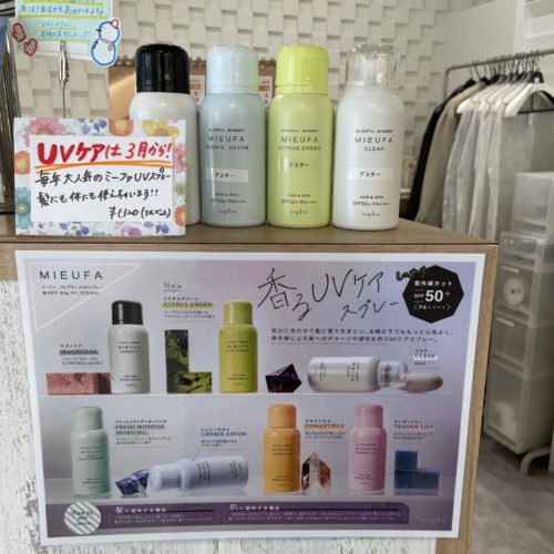 こんにちは!アシスタントの松浦です! 今日はUVスプレーをご紹介します! こちらのスプレーはMIEUFAのもので髪にも体にも使えます! 香りも豊富で7種類あります! マグノリア、シトラス、ジャスミン、サボン、キンモクセイ […]
