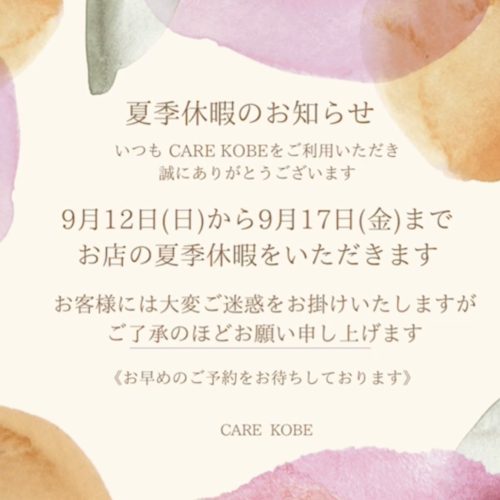明日から6日間 CARE神戸店は夏季休暇でお店をお休みさせて頂きます。 お客様には大変ご迷惑をおかけ致しますがよろしくお願いします。 夏季休暇明けは18日からご予約お取り出来ます。 沢山のご来店楽しみにお待ちしています!