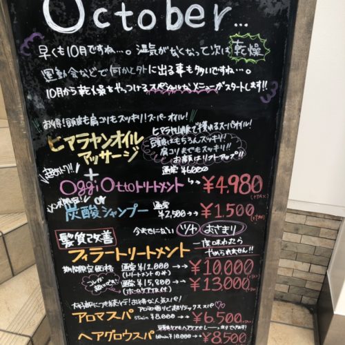 こんにちは!アシスタントの草野です! 10月ももう少しで終わりますね! 10月が終わってしまう前にキャンペーンでお得なスパメニューでもいかがですか? オススメはアロマスパです!お好きなアロマの香りを選んで頂き 香りとマッ […]