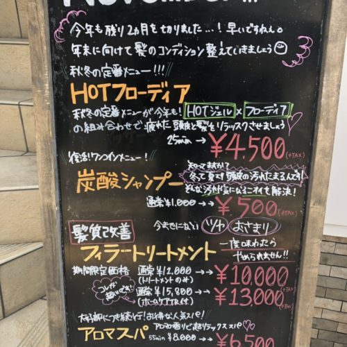 こんにちは!アシスタントの草野です! 11月に入り寒くなりましたね! 今月のおすすめメニューはHOTフローディア! HOTジェルで疲れた頭皮をマッサージし仕上げはフローディアのトリートメントでさらさらに仕上げますよ! ち […]